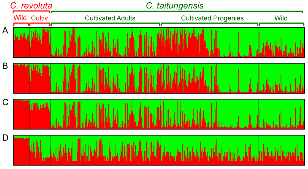 Assignment test by Bayesian clustering analysis of wild populations and cultivated samples of C. revoluta and C. taitungensis at clustering number K = 2. Patterns of genetic composition of each individual are detected by (A) 262 neutral loci; (B) species-associated loci at criteria LOD 3.0; and (C) LOD 6.0; and (D) the loci of linkage subgroup 1 of LOD 6.0.