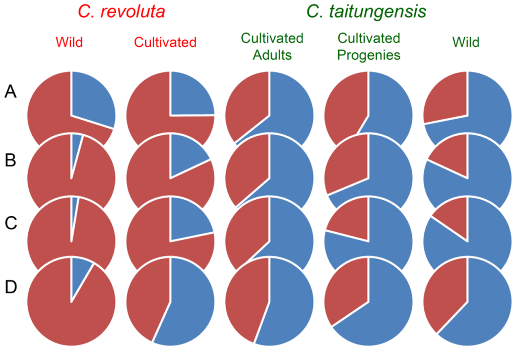 Neutral genes that experienced different rates of gene flow provide hints for investigating the asymmetric gene flow [16]. For evaluating the genetic impact of the horticultural introduction of C. revoluta on the native C. taitungensis, population genetic analyses with the multilocus neutral loci were used to address two specific objectives of this study: (1) to reevaluate the genetic diversity of the cultivated and extant wild populations of C. taitungensis by multilocus marker and (2) to evaluate the degrees of introgression between C. revoluta and C. taitungensis in Taiwan. In this study, we also discuss the mechanisms (e.g., geographic isolation or niche specialization) of the divergence of these two phylogenetically related species through an examination of the horticultural introgression.