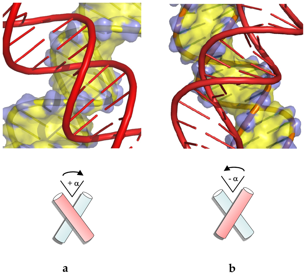 Left-handed B-DNA crossovers that are characterized by negative values (−40° and −80°) of the crossing angles have been also observed in many RNA or DNA crystals. However, this mode of assembly in which the helices are juxtaposed by groove-groove interactions, prevents the tight self-fitting of the double helices and is neither stabilized by direct sequence-specific contacts between DNA segments, nor by intermolecular divalent cation bridges [] (Figure 1b).
