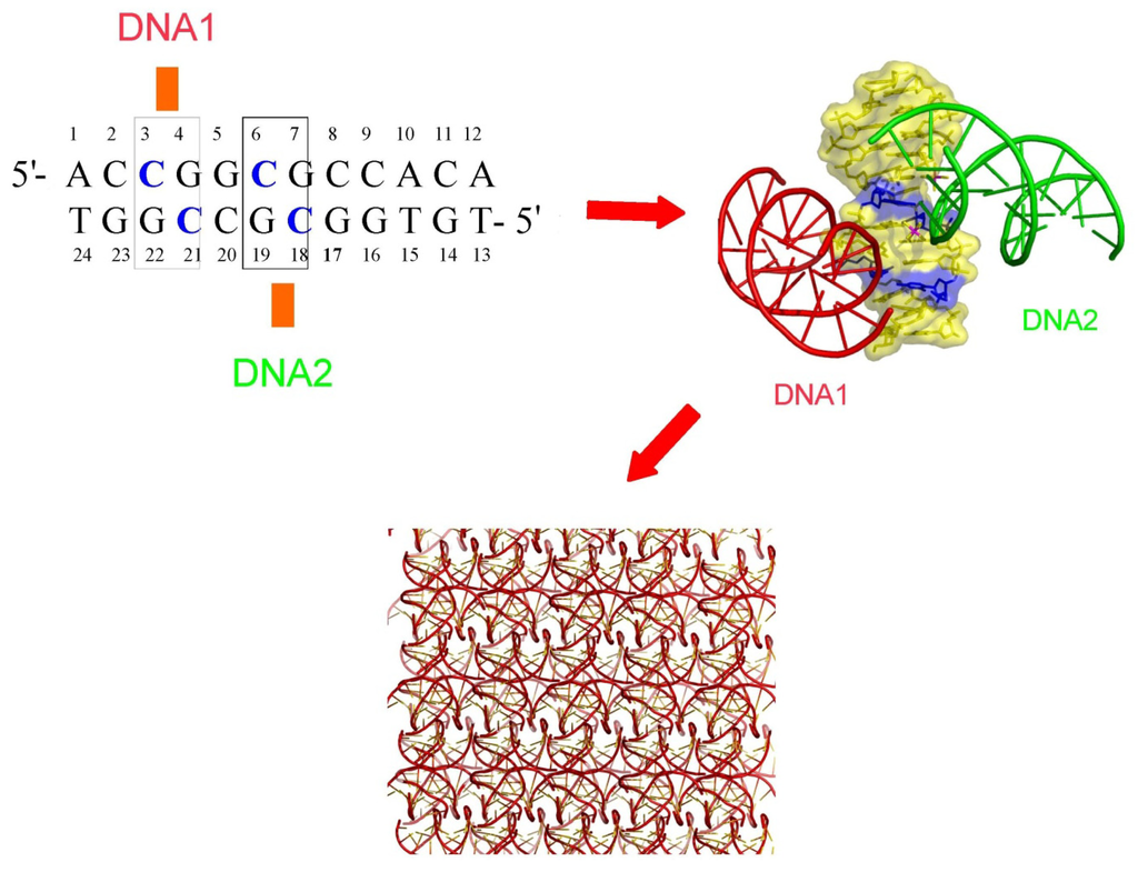 Right-handed crossovers of B-form DNA double helices are therefore unique in that they are assembled by a sequence-dependent interaction. Crystallographic studies have shown that while the B-DNA double helix dictates the geometry of inter-helical assembly, cytosines play a key role in controlling the interaction through specific interaction of their N4 amino groups with phosphate groups [–]. These studies provided the basic principles for designing DNA sequence that control the precise organization of double helices into a 3D lattice (Figure 2).