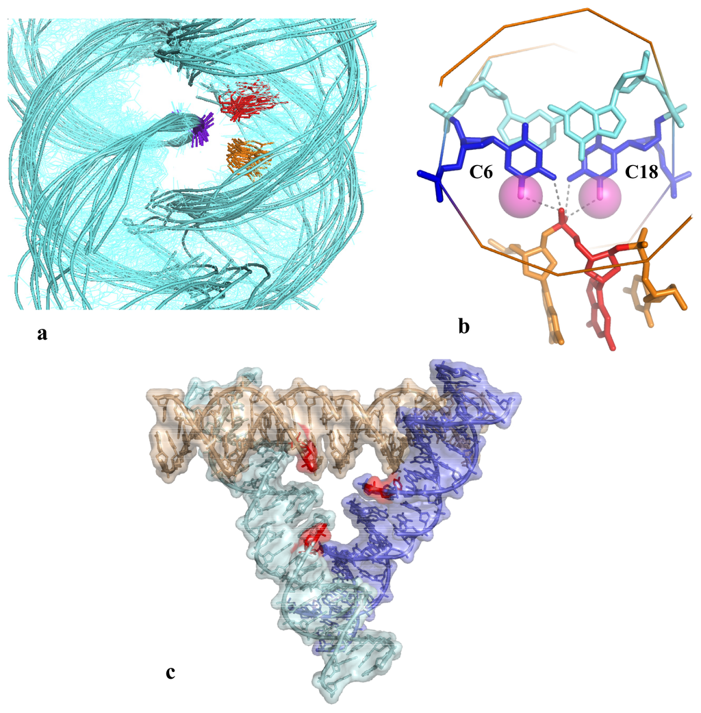 Molecular dynamic simulation studies have also shown that the stabilisation of right-handed crossover increases as the Mg2+/duplex stoichiometric ratio increases []. A minimum of 8 Mg2+ per duplex is required to keep the duplexes anchored together with an associated binding free energy of about −4 kcal·mol−1. Higher Mg2+ concentrations (16 Mg2+/duplex) strengthen the helical interaction further and increase the associated binding free energy to −7 kcal·mol−1. At lower Mg2+ concentrations (4 Mg2+/duplex) no net attraction was visible. However, monovalent ions cannot replace the effect of Mg2+ to induce attraction between DNA helices even at high Na+ concentration (56 Na+/duplex). Importantly, during the simulation, Mg2+ ions occupied the divalent cation binding sites observed in the crystal structure of self-fitted duplexes. In contrast, no specific Mg2+ binding site was observed in the control simulations of isolated duplexes and hence we suggest that specific binding sites are formed simultaneously with the formation of the crossover structure. These data are consistent with the crystallographic studies that showed that the diffraction power of crystals of duplexes assembled via groove-backbone interactions was strictly correlated with the Mg2+/duplex stoichiometric ratio. Best diffracting crystals were obtained with 16 Mg2+ per oligonucleotide while very large crystals obtained with 1 Mg2+ per oligonucleotide did not diffract at all [].