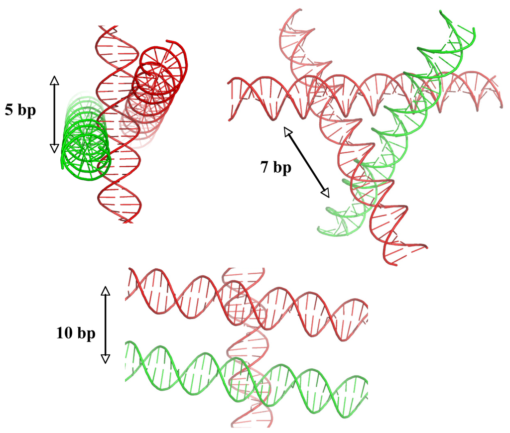 DNA supramolecular construction set. The double helix imposes discrete geometric solutions for its 3D assembly into simple motifs. Representation of packing motifs formed by two helices crossing a third one, at anchoring points separated by 5 bp, 7 bp and 10 bp, respectively. An equilateral triangle is formed when the intersection points of three DNA segments are 7 bp distant.