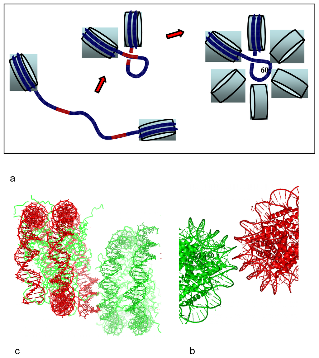 In this context, the recent discovery that right-handed crossovers are stable at close to physiological conditions [] supports the idea that close DNA-DNA interactions contribute to organize the nucleosomal or linker assembly within the chromatin fibre as described in Figure 5a[,]. In this model, while the double helix geometry controls the overall geometry of the fibre, sequence patterns promote close DNA-DNA associations in specific regions, between DNA linkers or nucleosomal DNA (Figure 5a).