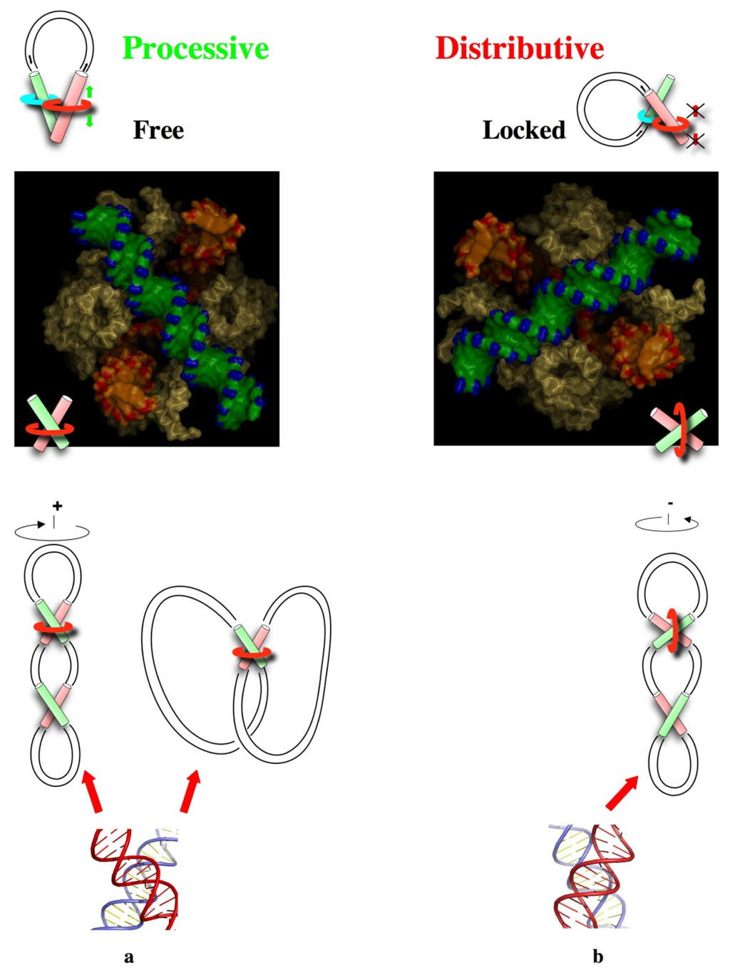 Second, a recent study has demonstrated how binding right-handed crossovers specifically across their large angle imposes a different topological link between the type II topoisomerases and the plectonemes of opposite sign (Figure 6, top) []. Within (+) supercoiled DNA, the enzyme ring is perpendicular to the long supercoiled DNA axis and is not topologically linked to the circular DNA chain. In (−) supercoiled DNA, the enzyme ring that is parallel to the supercoiled DNA axis forms an interlocked knot and is topologically linked with the circular DNA. The different topological links affect the enzyme freedom of motion and processivity and provide an explanation for the chiral discrimination [].