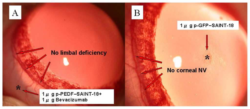 (A) Limbal deficiency test: 1 μg of bevacizumab + 1 μg of p-PEDF-SAINT-18. No inhibition of the normal limbal vessels was noted on day 15; (B) The effect of GFP on corneal neovascularization: The 1 μg of p-SAINT-18 gene complex was implanted into the corneal stromal pocket. No limbal vessels began sprouting into the cornea on day 15.