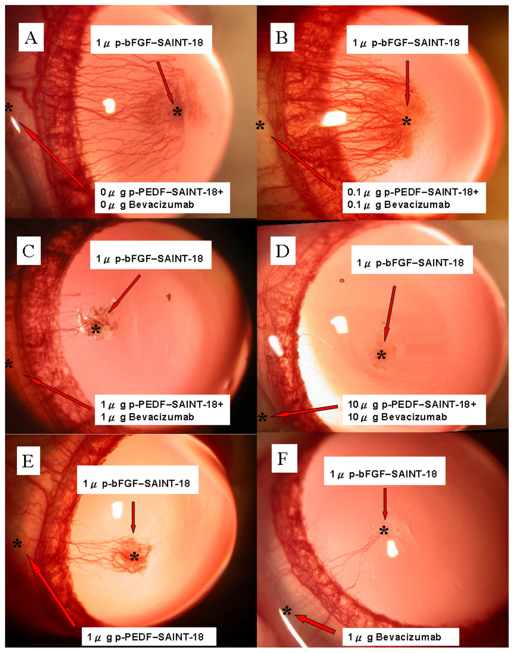 Slit-lamp photographs of Sprague-Dawley rat corneas showing corneal NV for the four experimental groups on day 15. (A) 0 μg + 0 μg of bevacizumab + p-PEDF-SAINT-18, respectively (control group; the substitute was purified water); (B) 0.1 μg + 0.1 μg of bevacizumab + p-PEDF-SAINT-18, respectively; (C) 1 μg + 1 μg of bevacizumab + p-PEDF-SAINT-18, respectively; (D) 10 μg + 10 μg of bevacizumab + p-PEDF-SAINT-18, respectively. * 1 μg of the p-Bfgf-SAINT-18 complex; (E) Subconjunctival administration of 1 μg of p-PEDF-SAINT-18 alone; (F) Subconjunctival administration of 1 μg of bevacizumab alone.