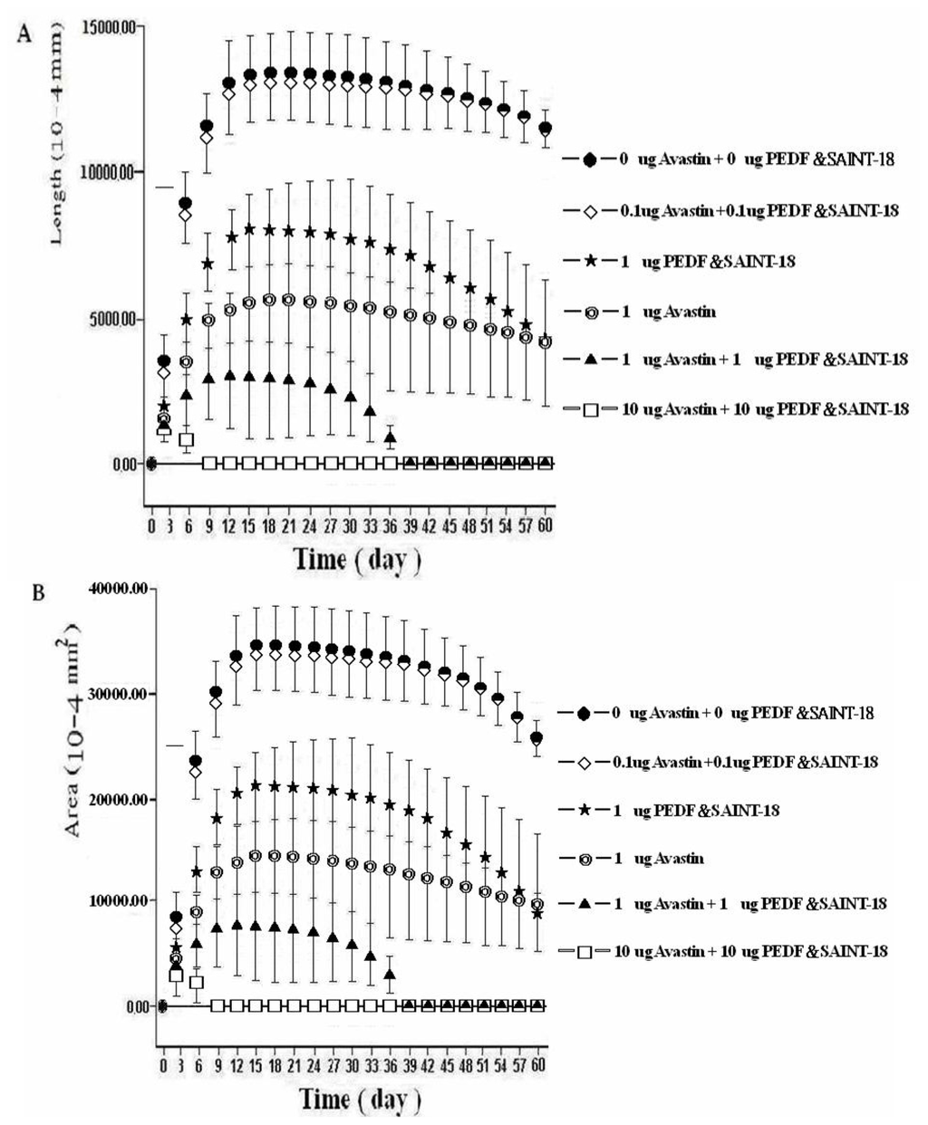 The mean lengths (A) and areas (B) of the corneal NV. The angiogenesis induced by 1 μg p-bFGF-SAINT-18 and in the treatments of the six different groups by subconjunctival injection. The vertical bars denote the standard deviation of the mean.