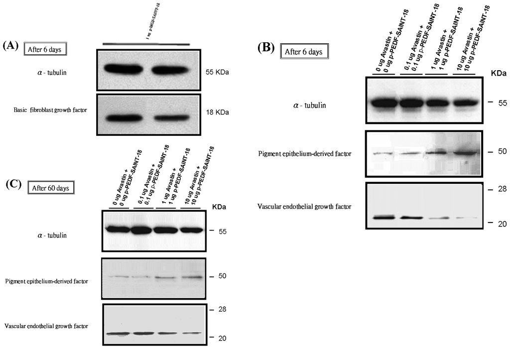 On day 6 after transfection, the rats in each group were killed with an overdose of pentothal, and the corneal samples were removed along the contour of the NV. The α-tubulin band was used as the control for normalization. The bFGF bands (molecular weight, approximately 18 kDa) were detected in the protein extracts from the groups treated with 1 μg p-bFGF using a rabbit anti-human bFGF polyclonal antibody (Figure 4A). The PEDF bands (molecular weight, approximately 50 kDa) produced with 0 μg, 0.1 μg, 1 μg and 10 μg of the PEDF-encoding plasmid was visualized. This band is also noted in the 0 μg PEDF group due to the presence of endogenous PEDF. The levels of bound VEGF protein were also estimated by western blot analysis on days 6 and 60 (Figure 4B,C).