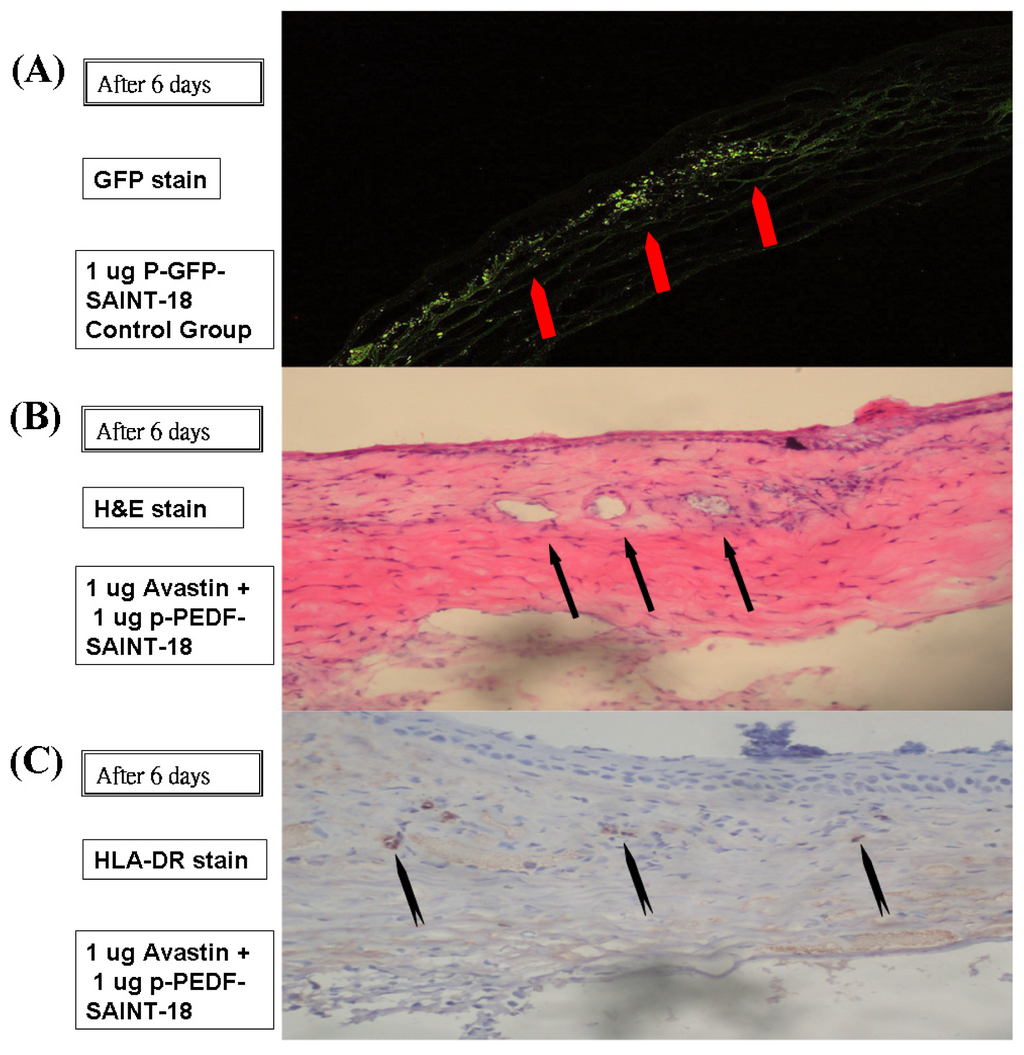 Six days after administration, the successful gene expression of p-GFP-SAINT-18 within the corneal was histologically evaluated (Figure 5A). A vast number of capillaries appeared in the corneal stroma, running from the limbal blood vessels up to the p-bFGF-SAINT-18 implant (Figure 5B). Inflammation could be detected by the presence of macrophages and other inflammatory cells, such as lymphocytes, but a mild immune response caused by HLA-DR was shown by IHC staining (Figure 5C).