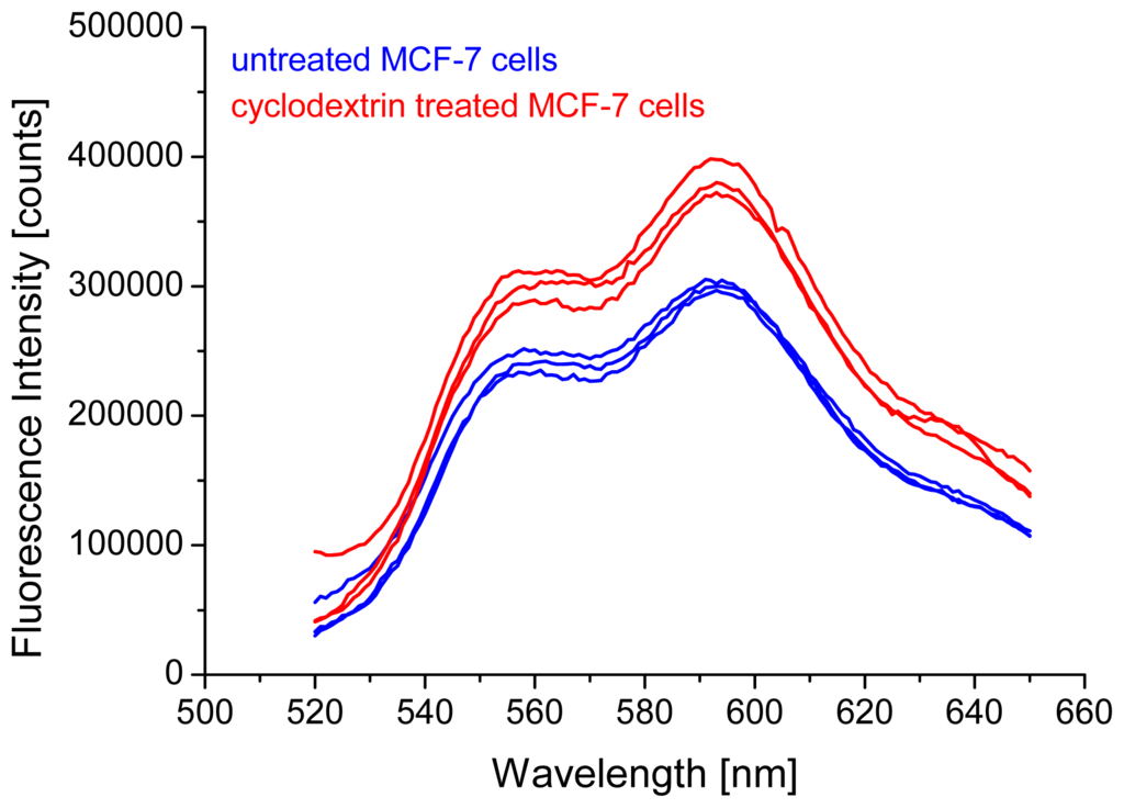 To examine cholesterol dependent cellular uptake of doxorubicin, we determined fluorescence intensity of untreated and cyclodextrin treated MCF-7 cells, after incubation with doxorubicin (2 μM) for 24 h. Fluorescence spectra are depicted in Figure 1 for three independent measurements of cell suspensions (1 × 10−6 cells) in each case. Obviously, the untreated cells show lower fluorescence intensities than cells upon cholesterol depletion.
