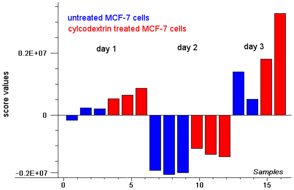 Principal component analysis (PCA); scores plot of PC1 (fluorescence intensity) for a set of 16 individual spectra obtained from three series (3 days) of experiments with samples of untreated and cyclodextrin treated MCF-7 cells.