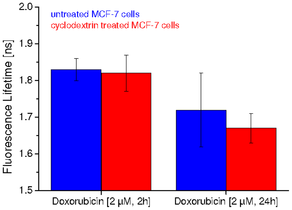 Fluorescence lifetime of untreated (blue bars) or cyclodextrin treated (red bars) MCF-7 cell monolayers after incubation with doxorubicin (2 μM) for 2 h or 24 h, respectively. Excitation wavelength: λex = 470 nm; medians and median absolute deviations (MADs) of 15 measurements (untreated cells) or eight measurements (cyclodextrin treated cells) are indicated.