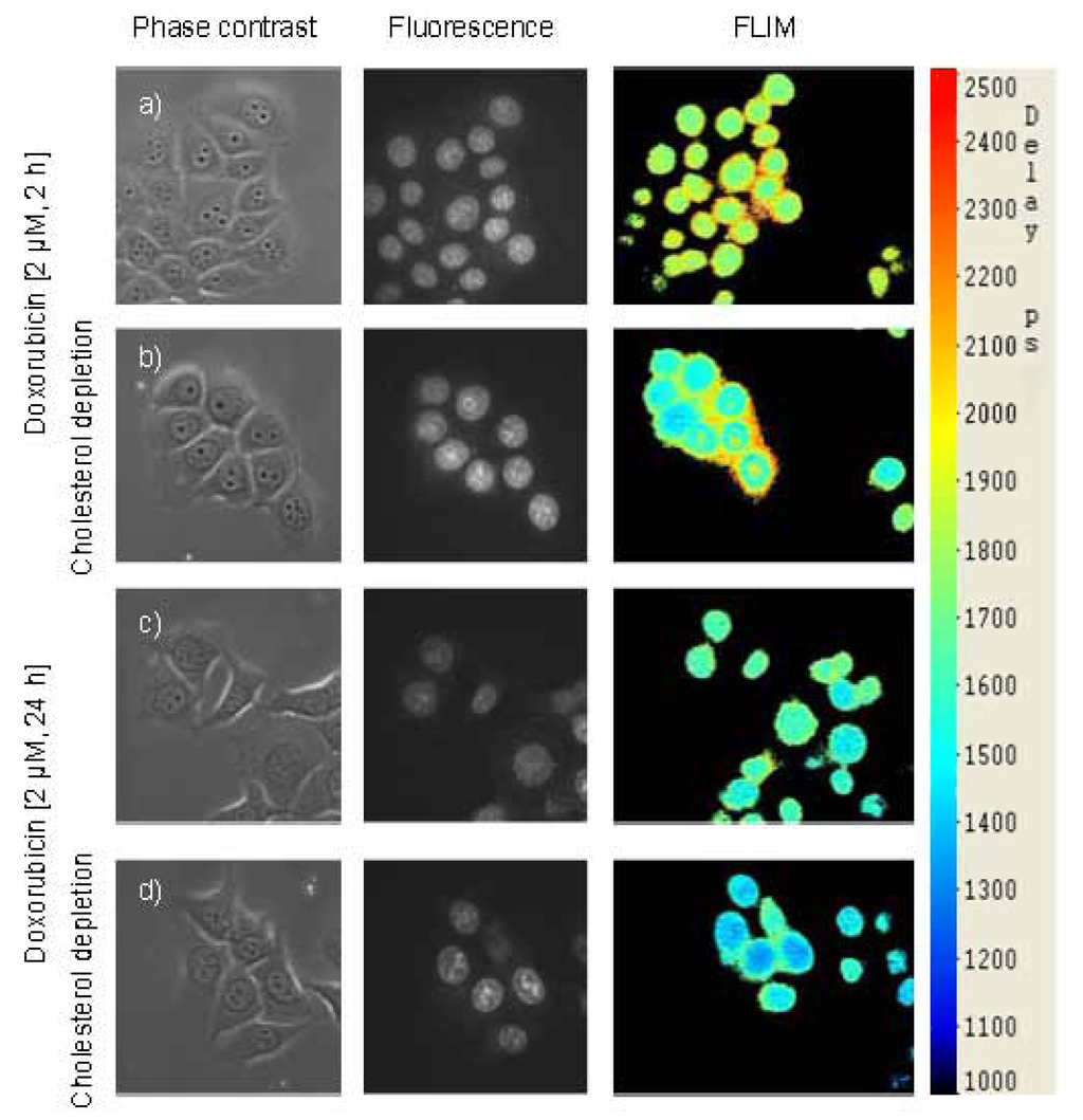 As demonstrated above, a combination of fluorescence spectroscopy, fluorescence imaging and fluorescence decay kinetics may be useful to measure cellular uptake, intracellular distribution and intermolecular interactions of the chemotherapeutic drug doxorubicin in cancer cells prior and during apoptosis. In particular, uptake of doxorubicin and drug response (assessed by changes in fluorescence lifetime) were examined in the context of cholesterol dependent membrane fluidity. Cholesterol content is suggested to be considered for future application of chemotherapeutic drugs.