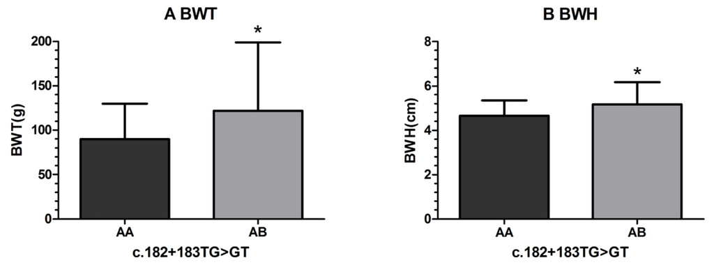 Significant differences in growth traits observed between different genotypes of c.182 + 183TG > GT.