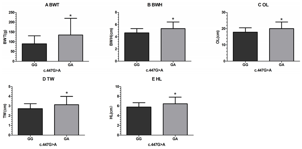 Significant differences in growth traits between observed different genotypes of c.447G > A.