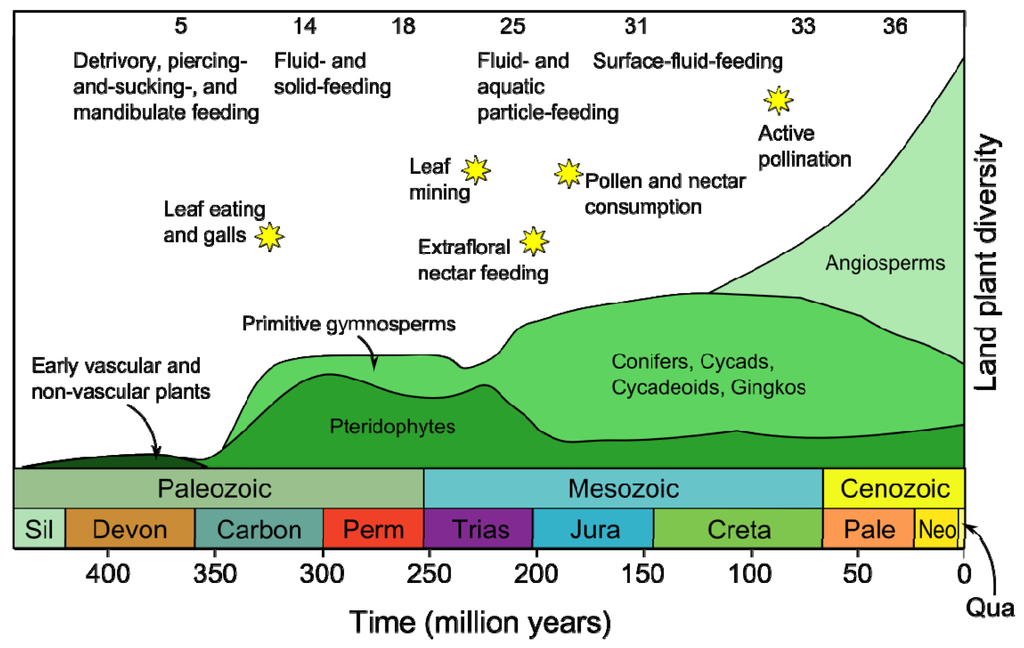 Evolutionary development of plant classes and insect feeding strategies. The evolutionary developments of new classes of plants are shown accompanied by new feeding strategies due to the interactions between plants and insects. The numerals on top refer to the numbers of feeding strategies present. Below are the dominating feeding strategies, followed by the first occurrences of certain feeding modes. The geographic time scale and colors are obtained from the International Commission of Stratigraphy, where Sil—Silurian, Devon—Devonian, Carbon—Carboniferous, Perm—Permian, Tria—Triassic, Jura—Jurassic, Creta—Cretaceous, Pale—Paleogene, Neo—Neogene and Qua—Quarternary (Adapted from [–]).