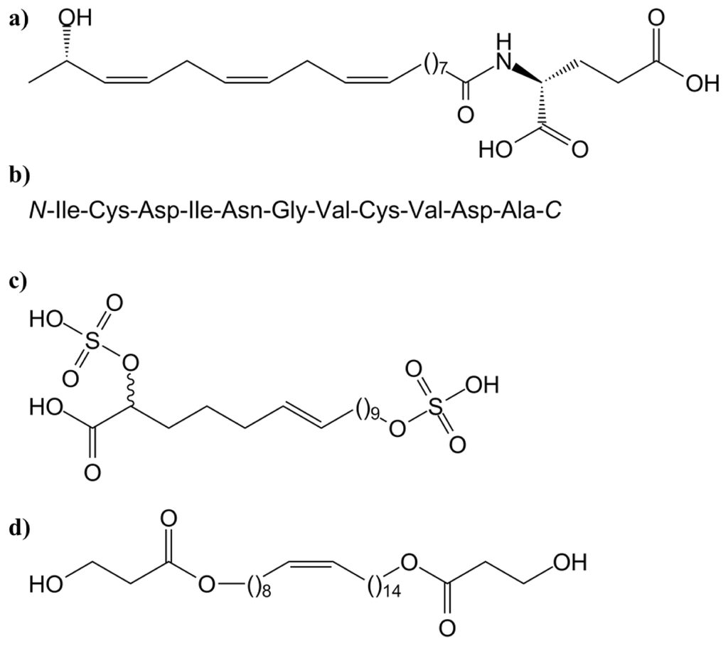 Structures of oral insect secretions. (a) Volicitin, N-(17-hydroxylinolenoyl)-l-Gln; (b) Inceptin, proteolytic peptides of the chloroplastic ATP synthase γ-subunit; (c) Caeliferin A16:1, (E)-2,16 disulfooxy-6-hexadecenoic acid; and (d) Bruchin c, (Z)-9-tetracosene-1,24-diol bis-(3-hydroxypropanoate)ester.