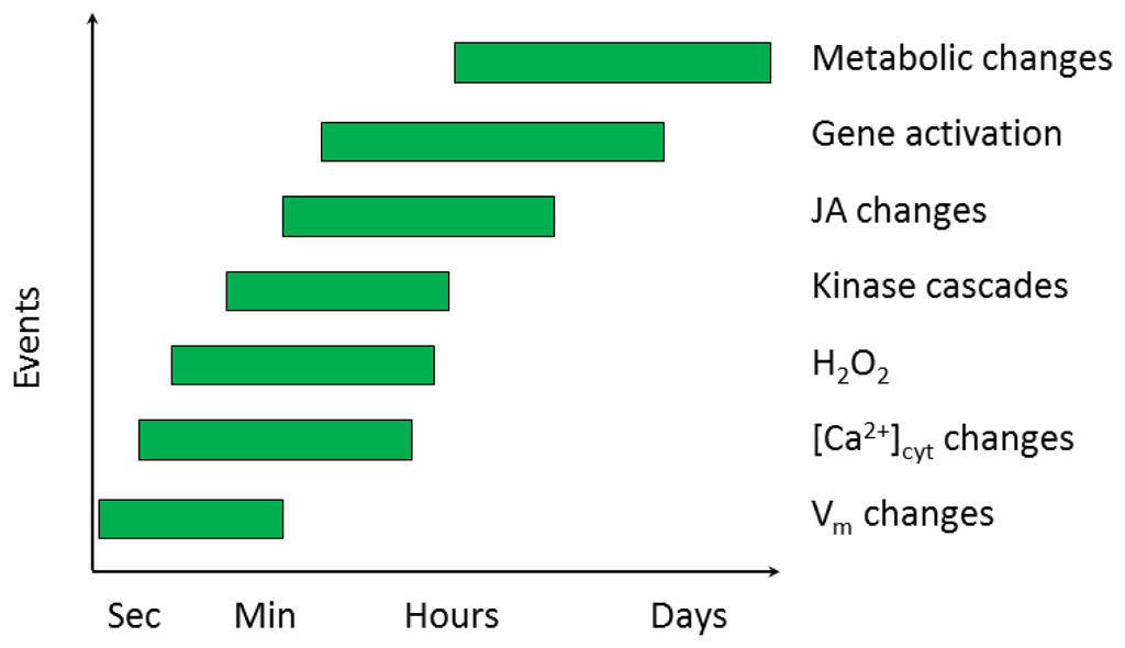 Events in plants after feeding by insect herbivores. Changes in the transmembrane potential (Vm) appear immediately upon herbivory damage and are tightly followed by changes in the intracellular Ca2+ concentration and generation of H2O2. Kinases and the phytohormone jasmonic acid (JA) are detectable within minutes. After roughly 1 h, gene activation followed by metabolic changes is seen (Adapted from []).