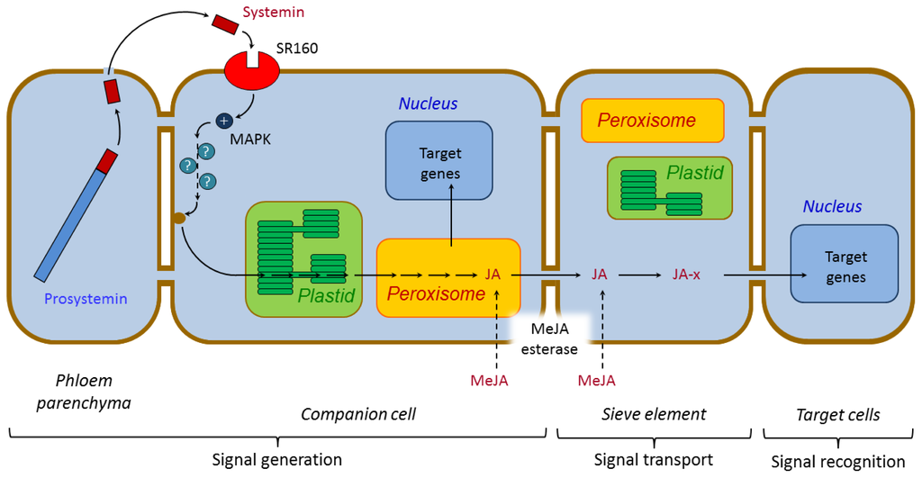 Model of systemic signaling and activation of defense genes in response to wounding by insect attack. After wounding, the systemin peptide is released from the C-terminal end of its precursor prosystemin by proteolytic processing. Systemin then enters the apoplast, where it binds to a membrane-bound receptor (SR160) to initiate an intracellular signaling cascade. The cascade includes the activities of a MAP kinase (MAPK), and a couple of unknown intermediates, leading to the release of polyunsaturated fatty acids (PUFAs) by phospholipases, from the membranes. The biosynthesis of JA takes place in the chloroplast and peroxisome within the companion cell, after which it might be transported long distances via the phloem. Plasmodesmatal connections between different cell types are shown as brown pipes. JA or a covalently modified form of JA (JA-x; such as JA-Ile) activates target gene expression in distal undamaged leaves. Esterases may convert exogenous MeJA to JA upon diffusion of MeJA across membranes. For simplicity, cell types presumed to be involved in phloem unloading of the signal are not shown. Mobile signals are shown in red and nonmobile signals in blue. Putative steps are denoted with dashed arrows (Adapted from [,]).