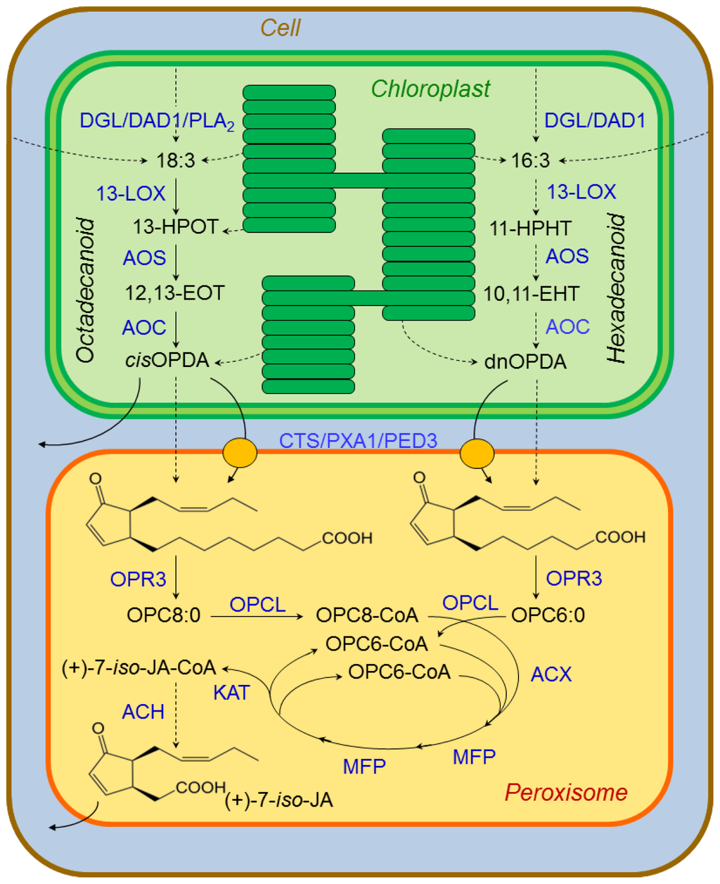 Biosynthesis of jasmonic acid in the chloroplast and peroxisome. Polyunsaturated fatty acids (18:3 and 16:3) released from the cell, chloroplast and/or thylakoid membrane are precursors for the biosynthesis of jasmonic acid (JA). Within the chloroplast, cis-(+)-12-oxo-phytodienoic acid (cisOPDA) and dinor-OPDA (dnOPDA) are formed via the octa- and hexadecanoid pathways. After transport into the peroxisome, OPDA (dnOPDA) is reduced to OPC8:0 (OPC6:0) and undergoes three (two) cycles of β-oxidation that results in the production of (+)-7-epi-jasmonic acid. The reactions are catalyzed by lipoxygenases (LOX), allene oxide synthase (AOS), allene oxide cyclase (AOC), ATP-binding cassette (ABC) transporter COMATOSE (CTS/PXA1/PED3), 12-oxophyto-dienoate reductase (OPR3), OPC CoA ligase1 (OPCL), acyl-thioesterase (ACH), 3-ketoacyl-CoA thiolase [], acyl-CoA oxidase (ACX) and a multifunctional protein (MFP). Enzymes are shown in blue. Arrows show the well characterized reactions, whereas dashed arrows show steps that are still hypothetical, and for which the corresponding enzymes remain to be identified. (Adapted from [,]).