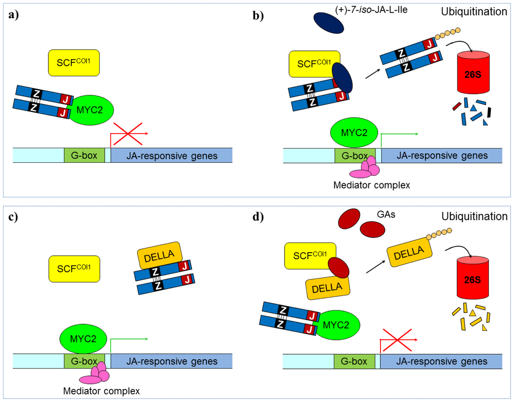 Model of jasmonate regulation of defense responsive genes. (a) In the resting state, in the absence of JA, JAZ proteins will bind to transcription factors, such as MYC2, and prevent expression of the JA-responsive genes; (b) In the active state, wounding promotes JA biosynthesis, resulting in accumulation of (+)-7-epi-jasmonyl-l-isoleucine ((+)-7-epi-JA-l-Ile). The hormone will bind to and stabilize the COI1 F-box subunit of the COI1 E3 ubiquitin ligase enzymatic complex (SCFCOI1), which in its turn bind to the Jas motif (J) of the Jasmonate ZIM-domain protein (JAZ), leading to ubiquitination and subsequent degradation by the 26S proteasome (26S). The transcription factors will now be free to recruit the RNA polymerase II transcriptional machinery to the promoter of the JA-responsive genes, assisted by universal adaptors, such as the Mediator complex; (c) In the presence of (+)-7-epi-JA-l-Ile and the absence of gibberellic acids (GAs), stabilized DELLA proteins (DELLA) will compete with MYC2 for binding of JAZ, thereby releasing MYC2 for activation of the JA-response; (d) If GAs are present, they will bind to DELLA and trigger degradation. This will liberate JAZ, promote the formation of the JAZ-MYC complex, and thereby repress the expression of JA-responsive gene (Adapted from [,]).