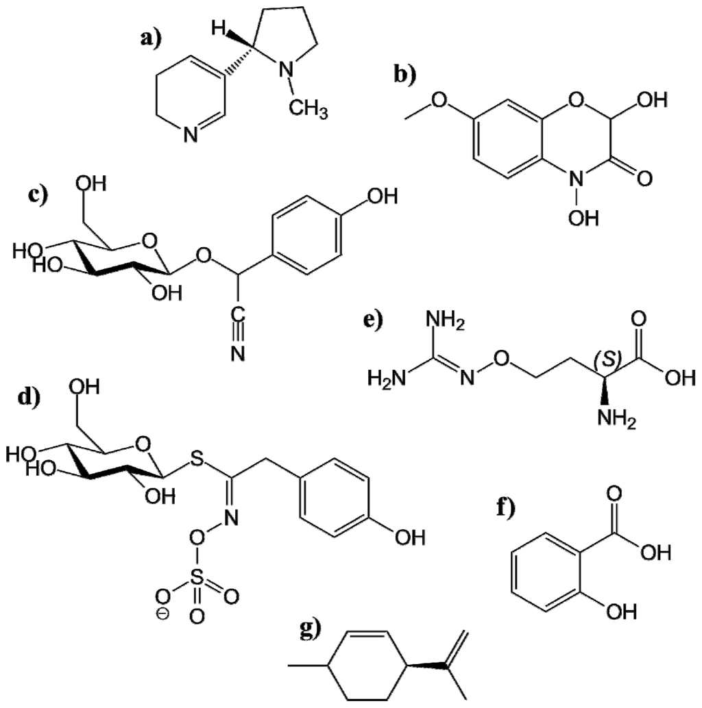 The widely distributed bioactive natural products alkaloids (>15,000 different alkaloids found in 20% of all vascular plants), are prevalently found in the Leguminosae spp. (legumes), Liliaceae spp. (lilies), Solanaceae spp. (nightshade plants) and Amaryllidaceae sp. (Amaryllis). They are well known for their metabolic effects in mammals, e.g., caffeine, nicotine, morphine, strychnine and cocaine, and have probably evolved as defense against insect herbivory []. The true alkaloids are biosynthesized from amino acids in the roots [] and accumulated above ground. They are alkaline and contain nitrogen in a heterocyclic ring, as in, e.g., nicotine (Figure 8a) and atropine. The ring structure includes pyridines, pyrroles, indoles, pyrrolidines, isoquinolines and piperidines. The pseudoalkaloids, such as caffeine and solanidine, are alkaline but not derived from amino acids. The protoalkaloids, such as mescaline, are alkaline and derived from amino acids, but the nitrogen is not in a heterocycle []. Alkaloids derived from quinolizidine, such as cytisine and sparteine, are efficient feeding deterrents against a number of herbivores []. Solanum demissum (nightshade potato) containing the alkaloid demissine is resistant to Leptinotarsa decemlineata (Colorado beetle) and Empoasca fabae (potato leafhopper). On the other hand, S. tuberosum contain the sterole derived pseudoalkaloid solanine that the beetles can detoxify, although it has a similar structure as demissine [].