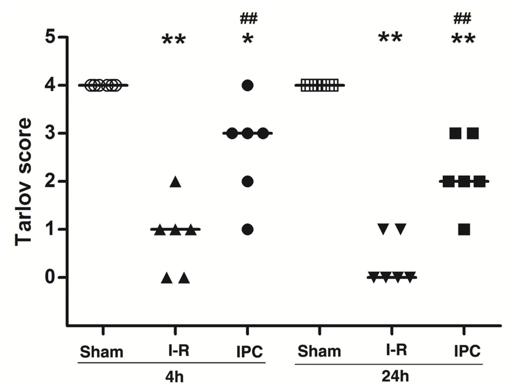 IPC improved neurologic function after spinal cord ischemia-reperfusion (I-R) injury. Neurologic function was assessed using Tarlov scores at 4 and 24 h after spinal cord ischemia. Data are presented as individual values for each animal, as well as median values for each group (n = 6/group). **p < 0.01 versus Sham group. ##p < 0.01 versus I-R group.