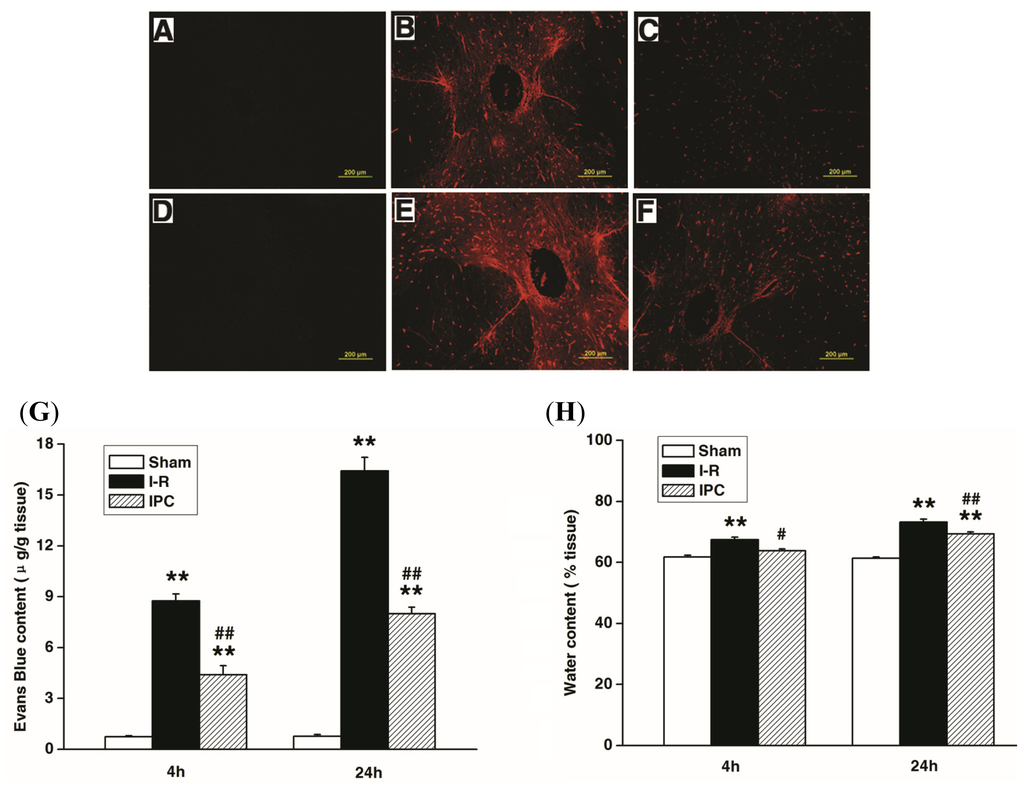 Evan’s Blue tracer is commonly used to evaluate the vascualr permeability. As shown in Figure 2, spinal cord I-R injury caused a marked increase in the amount of Evan’s Blue dye extravasation compared with sham controls, implying blood spinal cord barrier leakage. Furthermore, IPC treatment significantly reduced the amount of extravasation at 4 and 24 h after injury compared with the I-R group (Figure 1A–F). Quantitative analysis confirmed that I-R increased extravasation, while IPC attenuated this effect (p < 0.01) (Figure 2G). Assessment of water content showed similar results, as I-R increased water content due to spinal cord edema (p < 0.01), while IPC attenuated this effect at 4 h (p < 0.05) and 24 h (p < 0.01), as shown in Figure 2H.