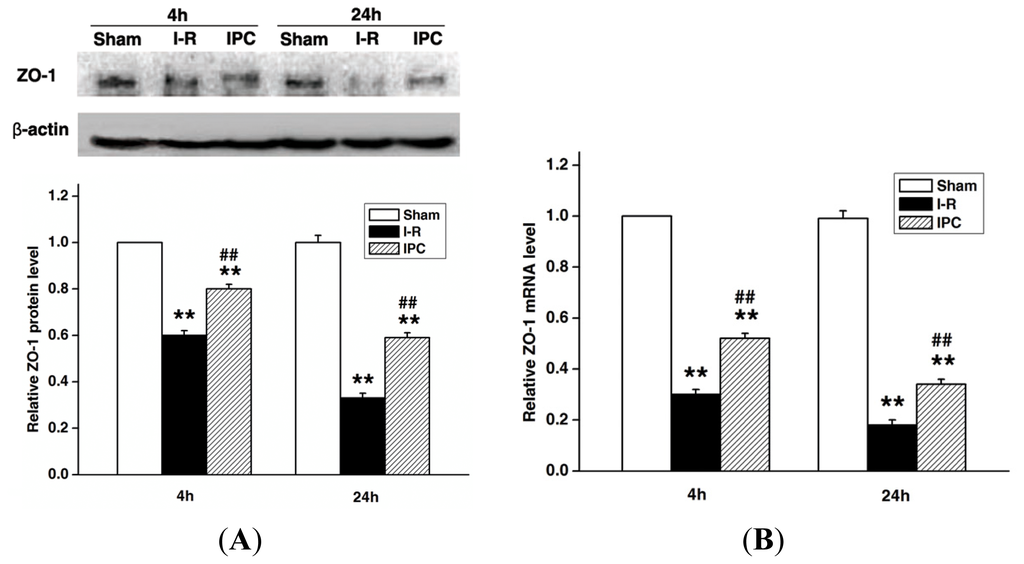 To investigate the role of ZO-1 in IPC-induced protection of blood spinal cord barrier integrity, expression levels were examined by Western blotting and real-time PCR. As shown in Figure 3, ZO-1 levels were decreased at 4 and 24 h after spinal cord I-R injury, and IPC treatment significantly attenuated this effect at both time points (p < 0.01). Double-labeling immunofluorescence for ZO-1 with CD31 (vascular endothelial cell marker) revealed that I-R injury led to a decrease and discontinuous arrangement of ZO-1-positive protein along the microvasculatures compared to sham controls, and IPC once again attenuated this effect. These data indicate that IPC preserves blood spinal cord barrier integrity after spinal cord injury by inhibiting the degradation of the tight junction molecule ZO-1.