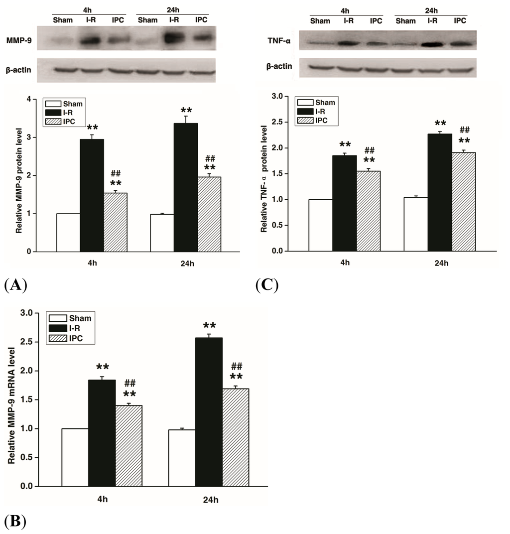 In the current study, IPC decressed MMP-9 and TNF-α expression induced by spinal I-R injury. As shown by Western blots and real-time PCR, MMP-9 expression was markedly increased at 4 and 24 h after I-R injury (p < 0.01). IPC significantly decreased MMP-9 expression compared to I-R controls at both time points (p < 0.01) (Figure 4A,B). TNF-α expression showed a similar increase after I-R, which was attenuated by IPC (p < 0.01) (Figure 4C).