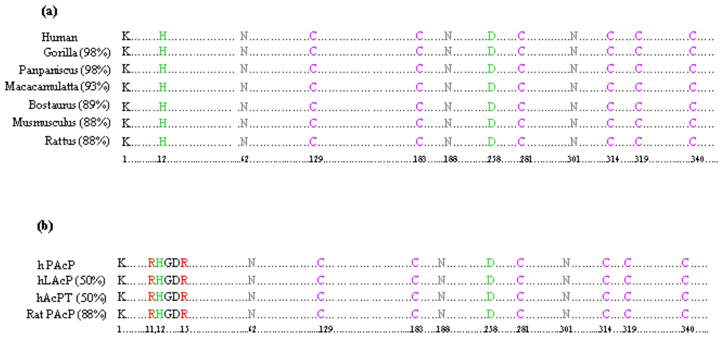 (a) Sequence alignment of human prostatic acid phosphatases shows that the active sites are evolutionarily conserved in closely related mammals. Only active site residues are shown with the amino acid position. Mature protein starts with lysine (K). Active site histidine (H) and aspartate (D) are highlighted in green, cysteine (C) with pink and glycosylation at asparagine (N) with gray. The number in the parenthesis indicates the percentage of similarity with hPAcP; (b) Sequence alignment of hPAcP with hLAcP, AcPT and rat PAcP shows that the active sites are evolutionarily conserved in closely related mammals. Only active site residues are shown with the amino acid position. Mature protein starts with lysine (K). Active site histidine (H) and aspartate (D) are highlighted in green, arginine (R) with red, cysteine (C) with pink, and glycosylation at asparagine (N) with gray. The hPAcP sequence is given in the first row, subsequent rows display the AcP sequence from other sources. The number in the parenthesis indicates the percentage of similarity with hPAcP.