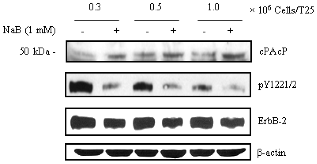 Effects of NaB on cPAcP protein expression and ErbB-2 tyrosyl phosphorylation. LNCaP C-81 cells were plated in different cell densities (0.3, 0.5 and 1 × 106 cells/T25) in regular culture conditions for 2 days and then treated with 1 mM NaB for 48 h. The cells were harvested and the total protein was subjected to western blot analyses. NaB effects on cPAcP protein expression and ErbB-2 phosphorylation at Tyr1221/2 levels were shown. β-actin was detected as a loading control. The data shown is a representative from three sets of independent experiments.