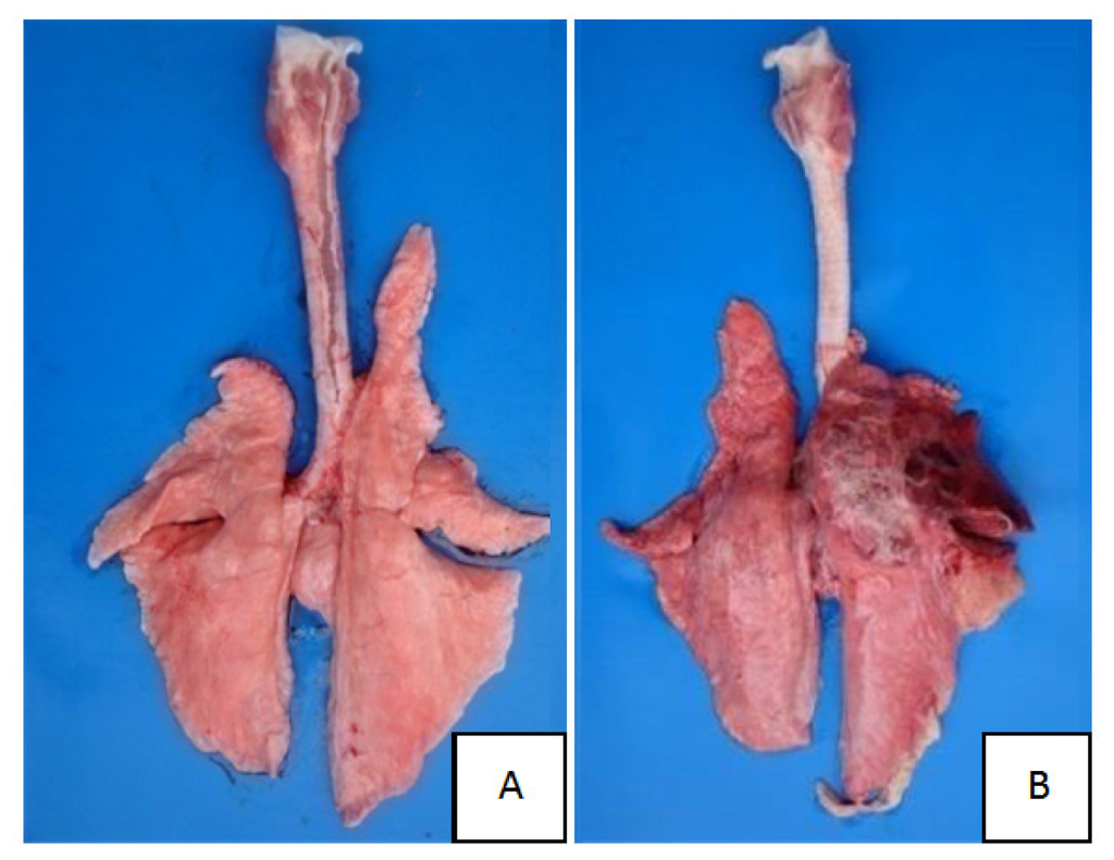 (A) Normal lung from healthy swine; (B) Damaged lung after APP infection (Lung in TG showing swelling, bleeding and fibrinous exudate sticking to the lung surface; while no lesion in CG).