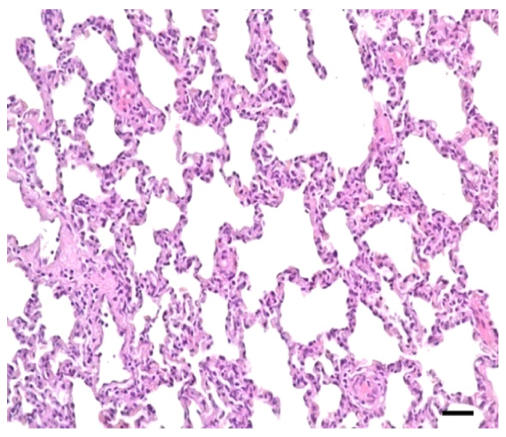 No lesions were observed in CG lung tissue (scale bar = 50 μm, 200×).