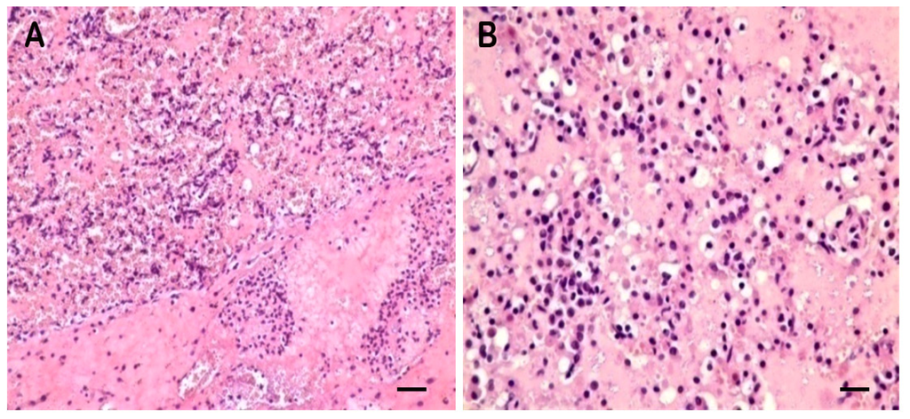 Alveolar cavities were filled with pink serum and red blood cells (A) (scale bar = 50 μm, 200×). and filled with serum, lymphocyte infiltration in the alveolar wall (B) (scale bar = 25 μm, 400×) in the lung of TG.
