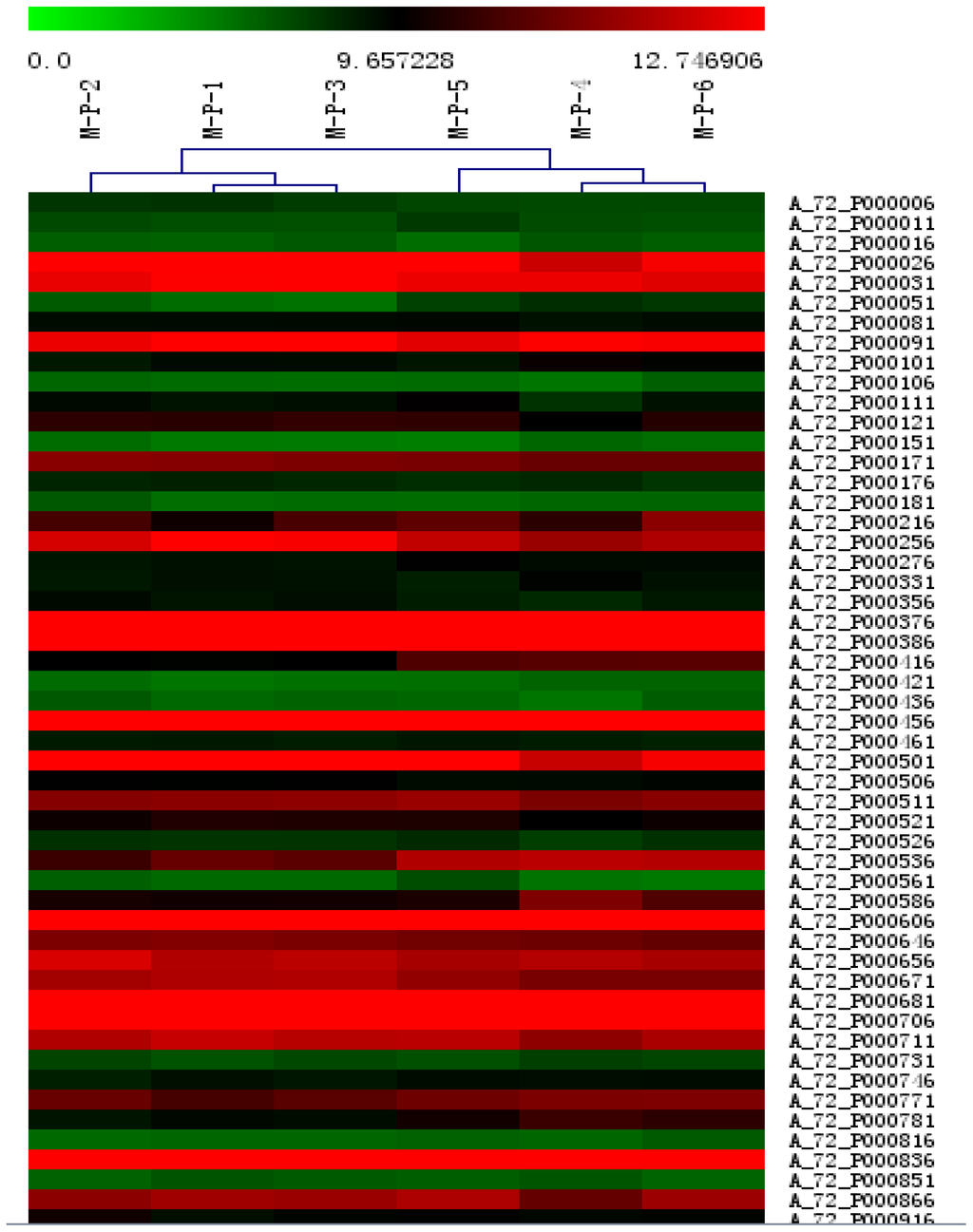 Hierarchical clustering was applied to the mean log-ratio of the replicated spots from the DE genes by the average linkage and using euclidean distance as the similarity metric (Figure 4). The expression profiles of samples were divided into two groups—one from the non-inoculated swine (M-P-1, M-P-2, M-P-3) and the other group from the inoculated swine (M-P-4, M-P-5, M-P-6).