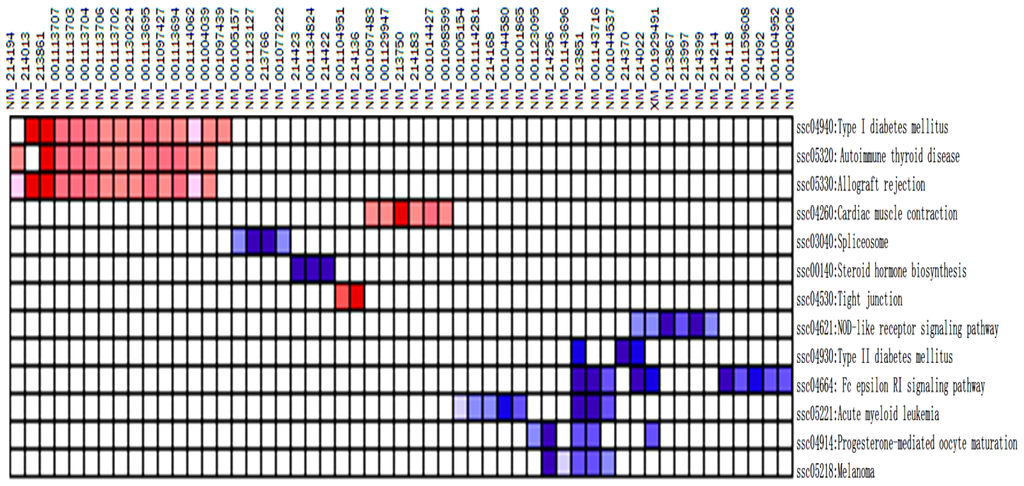 Twenty-eight pathways (Table 7) were down-regulated in the TG but upregulated in the CG. Six pathways (i.e., SSC05320, SSC04940, SSC05330, SSC04530, SSC04260 and SSC05412) were significant at a false discovery rate of <25%. Five pathways (i.e., SSC05320, SSC04940, SSC05330, SSC04530 and SSC04260) were significantly enriched at a nominal p value of less than 1% and 5%.