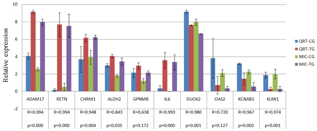 Ten genes (i.e., RETN, ADAM17, GPNMB, CHRM1, ALDH2, IL6, KLRK1, DUOX2, OAS2 and KCNAB1) were selected to confirm expression patterns using real-time qRT-PCR. The results indicate that the expression patterns of all the genes were consistent with the microarray data (r = 0.905 ± 0.125, Figure 7).