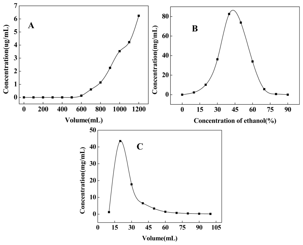 Dynamic leakage curves (A), dynamic desorption curves of poncirin by gradient elution (B), and isocratic elution (C) on column packed with D101 resin. Initial poncirin concentration in feed solution: 0.05 mg/mL; isocratic elution solution: 60% (v/v) ethanol; both adsorption and desorption flow rate: 1.0 mL/min.