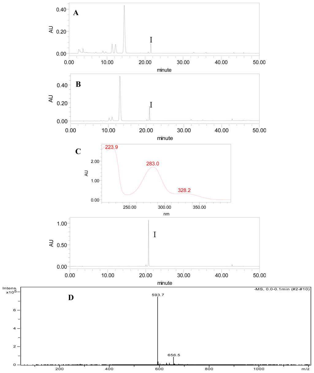 The effect of the two-step purification was shown in Figure 4, and the purities and recoveries of poncirin in different procedures were summarized in Table 4. The purity of poncirin in the crude extract of Ougan albedo was as low as 0.14%. After one-step of D101 resin purification, the purity increased to 5.30%, which was 37.86-fold that of the crude extract. The poncirin recovery was 71.55% (Table 3). In addition, HSCCC purification produced 2.1 mg poncirin with 96.56% purity (Figure 4C) and the recovery rate was 63.77% from a 60 mg sample (Table 4). The structure of the isolated poncirin was further identified according to its UV and MS data. UV data obtained from HPLC-DAD analysis showed that the purified poncirin had the same retention time with that of the authentic standard (20.7 min), as well as the same maximum absorption peaks. Further structure identification of the purified poncirin was confirmed by LC-MS. The [M-H]− ion at m/z 593.6 that had high abundance was observed in the purified poncirin, suggesting the molecular weight of poncirin might be 594.6 (Figure 4D). Additionally, typical fragment ions at m/z 330.4, 437, and 617.6 were detected in LC-MS2 chromatogram (Figure 4E). Compared with the mass spectrogram of the authentic standard, we can confirm ulteriorly that the purified compound was poncirin.