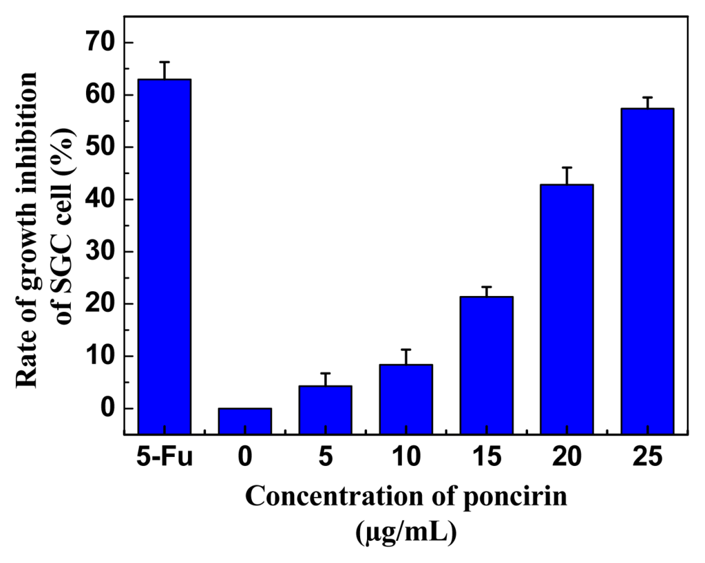 Inhibitory activity of purified poncirin on the growth of gastric cancer SGC-7901 cells. 5-Fu (positive control), 5-fluorouracil; Results are presented as mean ± S.D. (n = 9).