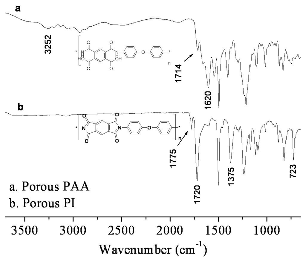 The broad peaks around 3252 cm−1 and 1620 cm−1 indicated the characteristic PAA N-H and amide C=O stretching modes, respectively. The peaks disappeared in the spectra of the membrane after thermal curing, and peaks at 1775 cm−1 (C=O asymmetric stretching), 1720 cm−1 (C=O symmetric stretching), 1375 cm−1 (CN stretching), and 723 cm−1 (C=O bending), which is primary indication of PI absorption bands, transition bigger with no characteristic PAA peaks. The ATR FT-IR spectra indicated that the porous PAA membranes were successfully converted to PI [8].