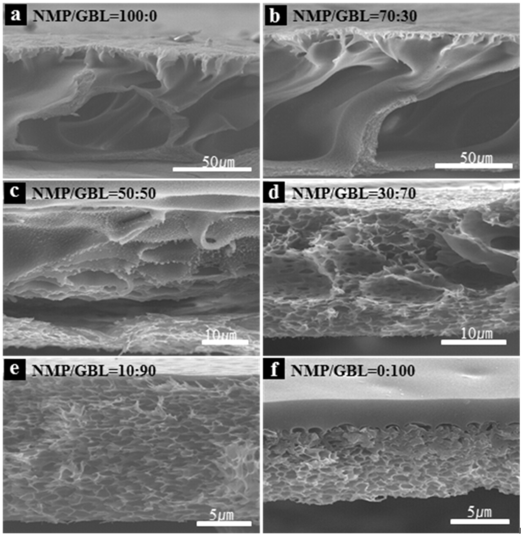 Figure 2. Cross-sectional SEM images of polyimide membranes as a function of the N-methyl-2-pyrrolidinone (NMP)/γ-butyrolactone (GBL) ratio in DI-water.