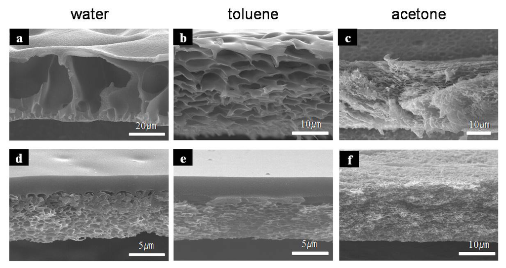 The porous morphology prepared during the wet phase inversion process can be adjusted by introducing a non-solvent to the coagulating bath [16]. We investigated various membrane morphologies prepared using PAA/NMP and PAA/GBL solutions, coagulated in other non-solvents: acetone, toluene, and DI-water.