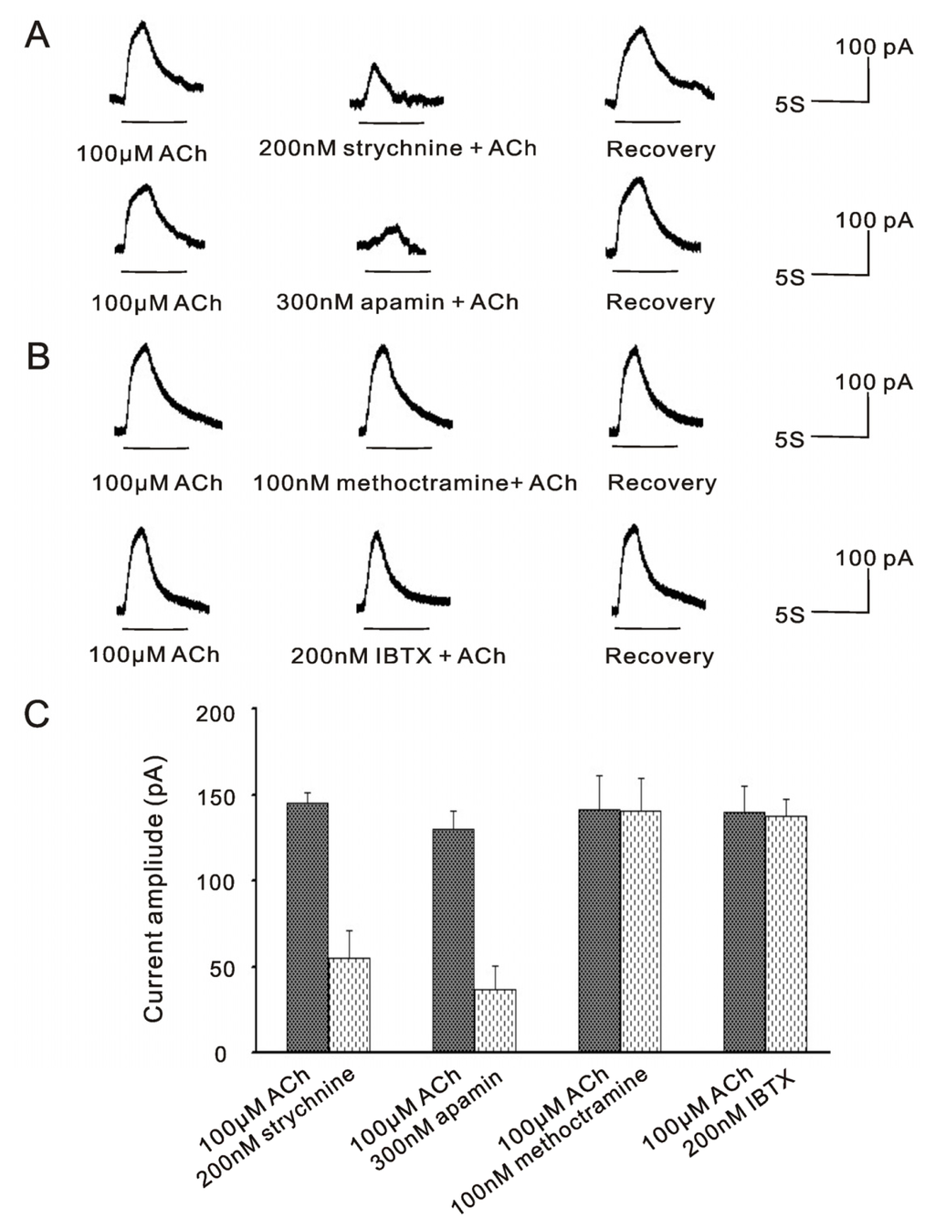 ACh activated SK2 currents in trypsin-isolated VHCs II. ACh routinely activated a fast inactivating outward current. (A) The current activated by 100 μM ACh was potently inhibited by strychnine and apamin, respectively; (B) The current activated by 100 μM ACh was insensitive to methoctramine and IBTX, respectively. All of these four results were obtained from the one same cell; (C) Bar histogram showed the inhibition effects of 200 nM strychnine, 300 nM apamin, 100 nM methoctramine and 200 nM IBTX on the current evoked by 100 μM ACh. Each point represents the mean ± SD of 6 cells. (Vhold = −50 mV).
