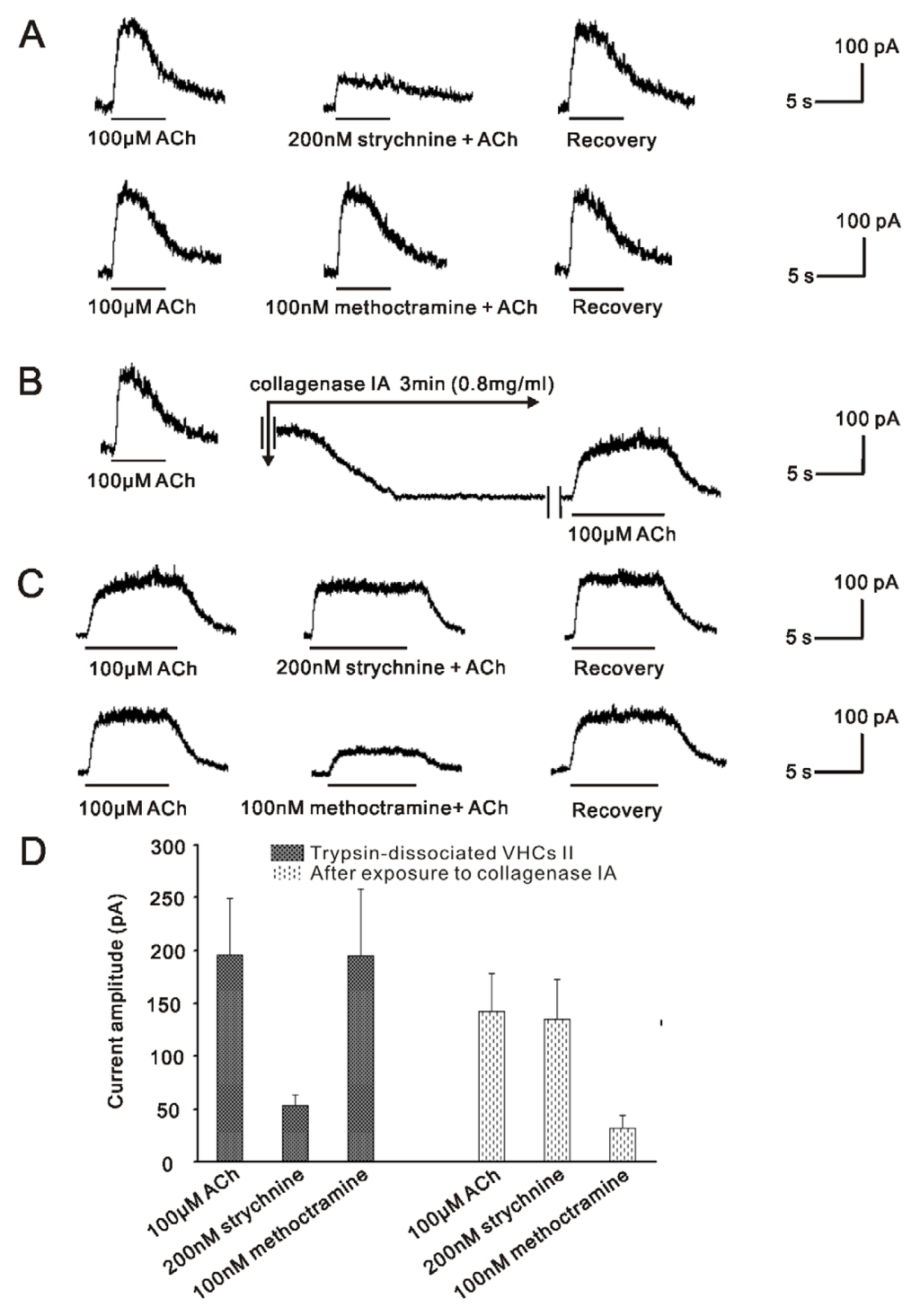 The above results indicated that there presented two distinct ACh receptors activated currents in VHCs II isolated by different enzymes. We noted that certain enzymes could affect or even damage the physiological properties of hair cells [16,22,23]. Therefore, we investigated the proteolytic effect of collagenase IA on the trypsin-dissociated cells to verify the hypothesis that two distinct channels mediated by m2mAChR and α9nAChR co-exist in VHCs II.