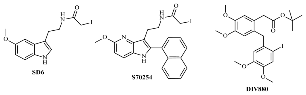 SD6 and S70254 were the products of a rational exploration of the basic features of melatonin analogs and are structurally related to the natural hormone (Figure 1). The influence of iodine atoms on the core structures was studied systematically, leading to interesting compounds that can be used to complete the set of labeled compounds for describing the molecular pharmacology of melatonin receptor(s). For DIV880, the process was a little different. The compound is an iodinated analog of a bromo-compound that resulted from a large screening process, similar to the compounds described elsewhere [11,12]. This compound was specific to MT2, with a pKi 2 logs “better” for MT2 than for MT1. Therefore, the iodine equivalent was synthesized, leading to its possible use as a specific probe for MT2.