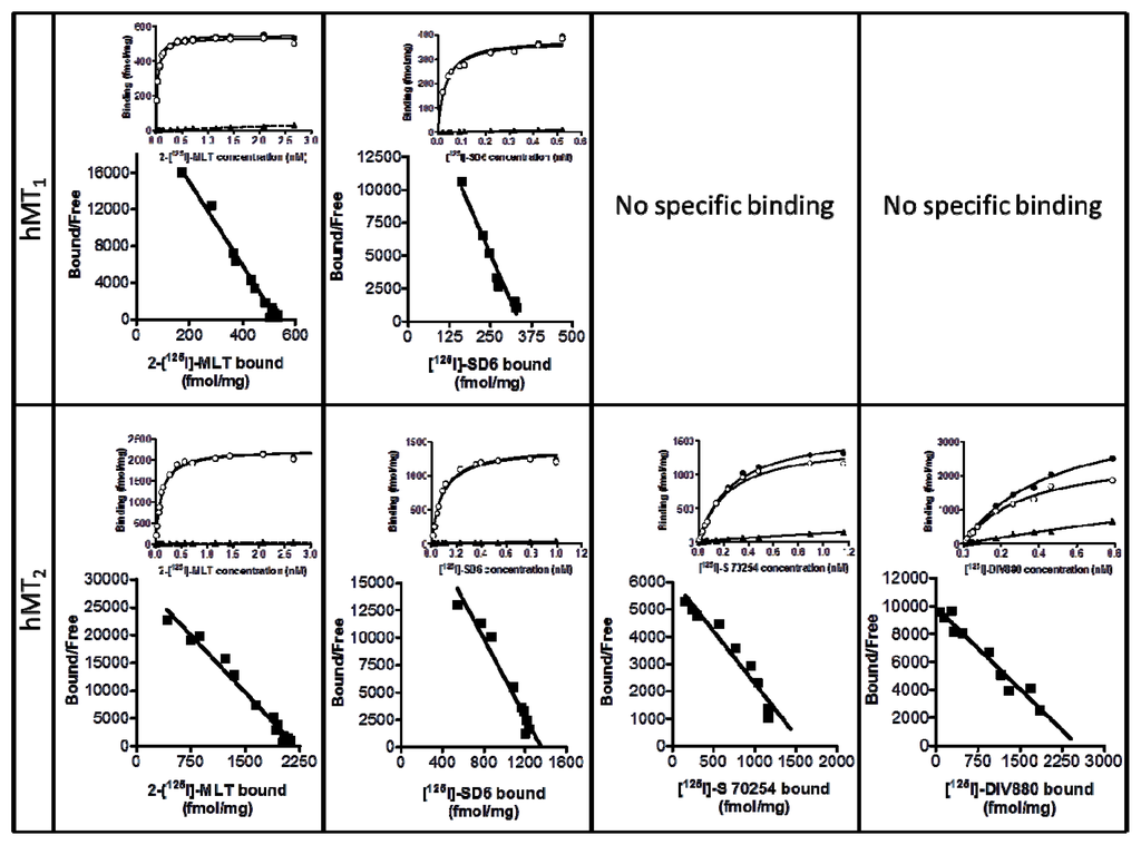 Saturation and Scatchard regression of the four radioligands of human recombinant MT1 and MT2 receptors: 2-[125I]-iodomelatonin, [125I]-SD6, [125I]-S70254, and [125I]-DIV880. The curves are individual results representative of at least three independent experiments. Full circles, total binding; open circles, specific binding; and close triangles, non-specific binding.