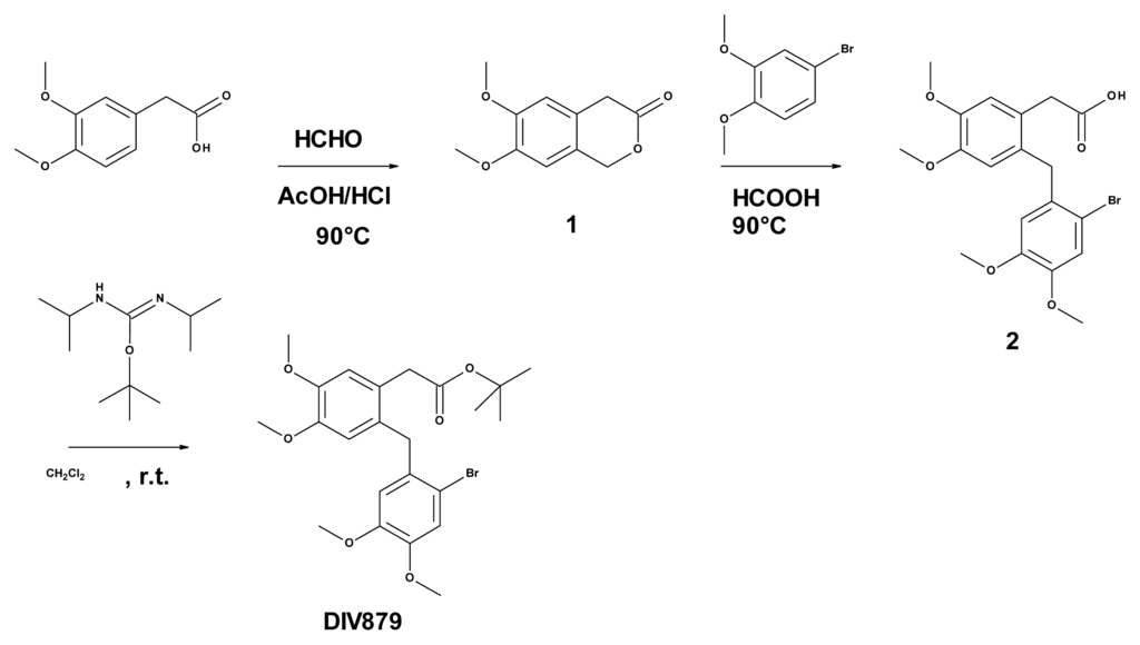3.6. Synthesis of Tert-butyl 2-(2-[(2-bromo-4,5-dimethoxyphenyl)methyl]-4,5-dimethoxy phenyl) Acetate (DIV879)