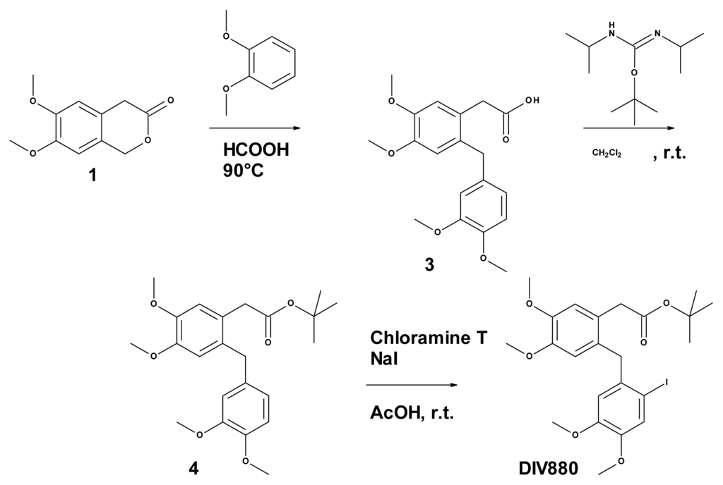 3.7.3. Synthesis of 2-(2-[(2-iodo-4,5-dimethoxyphenyl)methyl]-4,5-dimethoxy phenyl) Acetate (DIV880, Figure 4)